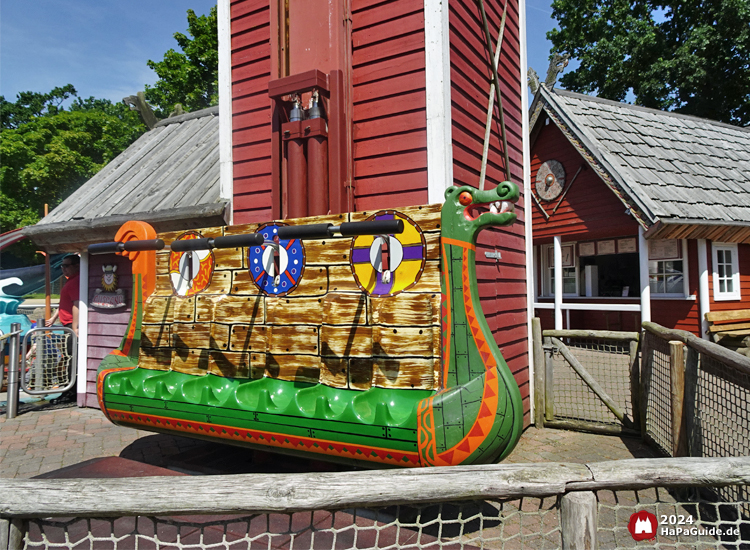 Am Zugang des Freifallturms wachen zwei Schlachtwölfe über Elins Luftreise. Geradewegs geht es auf das Drachenboot mit seinen sechs Sitzplätzen zu. Ist der Bügel geschlossen wird das Luftschiff per Druckluft nach oben gefahren. Überraschende Sprünge der Gondel bringen alle Kinder zum Lachen. Was folgt sind zahlreiche Hüpfbewegungen und Abwärtsfahrten aus den unterschiedlichsten Höhen. Von der Spitze bis zum Boden misst dieser Freifall für die Kleinen immerhin 7,5 Meter...